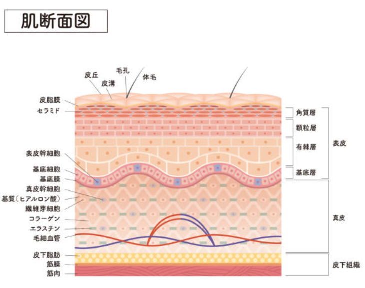 表皮の細胞は約28日〜のターンオーバーで垢として剥がれ落ちますが、真皮にはターンオーバーという概念がほとんどありません。