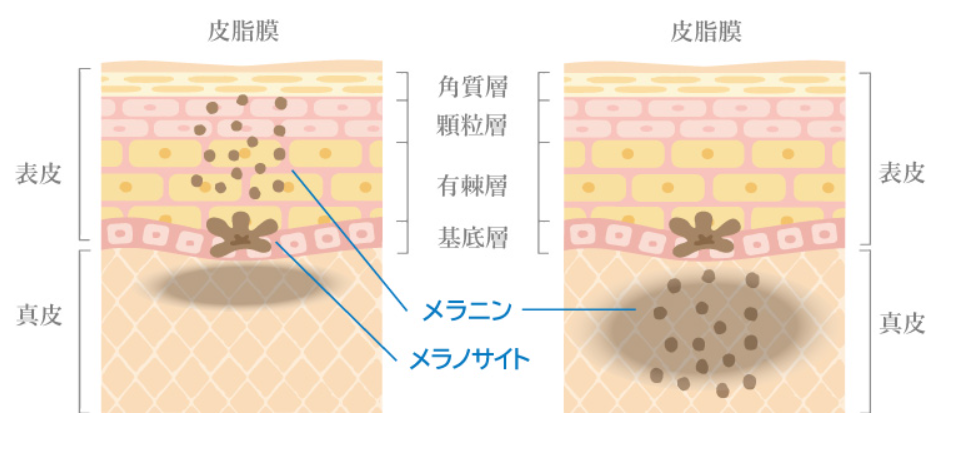 一般的なシミ(老人性色素斑など)は、肌の表面に近い「表皮」にメラニンが溜まっている状態ですが、真皮落ちシミは文字通りメラニンが深い層(真皮)まで落下してしまった状態を指します。