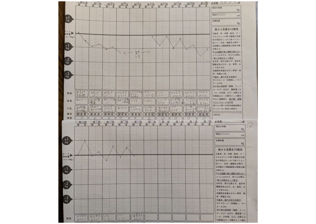 このダイエットプログラムは上のように朝晩2回、体重を測りグラフに書いていくのですが、ここ3日ほどは毎朝体重が100gずつ増えていっています・・・・